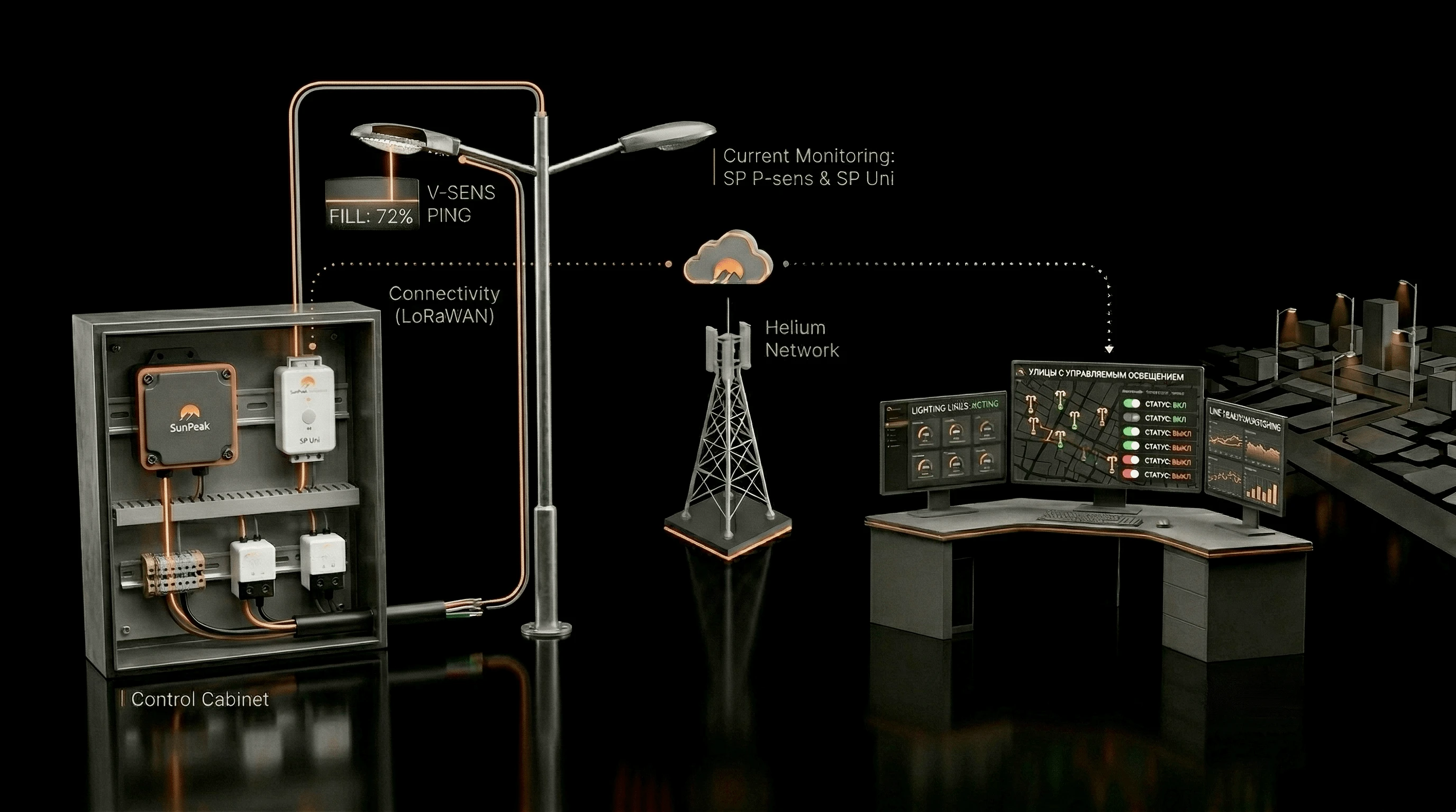 The core of the solution is the high-precision SP Light luminosity logger, which captures insolation levels in real-time. Unlike simple photo-relays that often trigger false alarms, our sensor analyzes light spectrum and intensity, transmitting data via a secure LoRaWAN protocol over distances up to 5 km. This allows a single control point to manage the lighting of an entire agricultural complex, logistics park, or city block—while ignoring car headlight glare or reflections from glass facades.