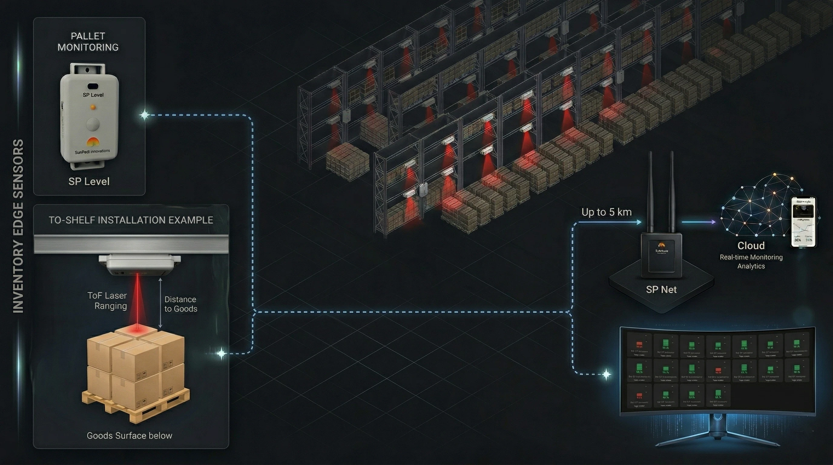 The core of the solution is the SP Level laser sensor, utilizing Time-of-Flight (ToF) technology. Unlike ultrasonic alternatives, the laser ignores warehouse noise and dust, delivering pallet level measurements with 1 cm accuracy. The sensor mounts above the storage cell in minutes via magnets or screws, requiring no communication or power cabling.